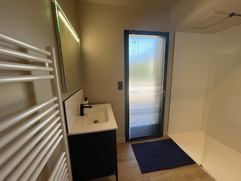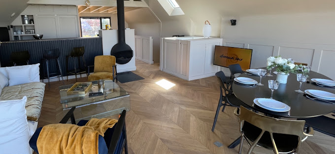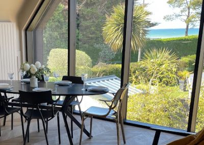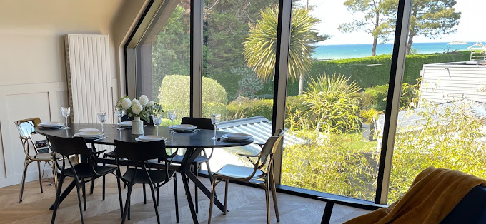 Notre grand salon et salle à manger lumineux sont les endroits parfaits pour se détendre. Le mur rideau donnant sur la mer crée une ambiance sereine et apaisante. Vous verrez même les bateaux au loin et les rochers se découvrir au gré de la marée. Cette vue spectaculaire transforme ces pièces en endroits magiques pour se rassembler, partager repas et apéritifs, lire, jouer ensemble ou simplement se relaxer devant la beauté de la nature.